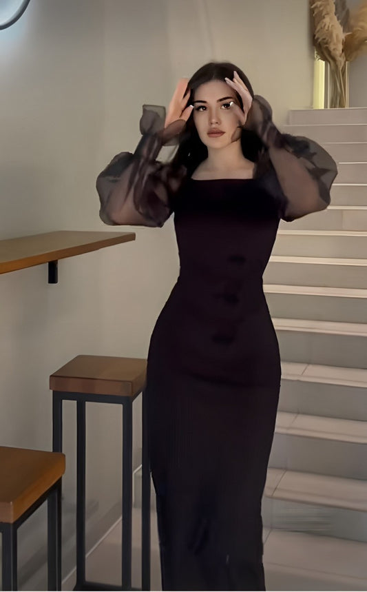 A Robe Longue Noir avec Manche Tule Buff BOUKHARA